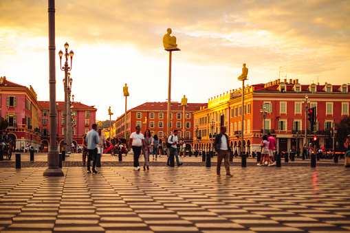 Entre l'avenue commerçante Jean Médecin et la Promenade des Anglais, ses façades colorées rouges lui apporte un charme italien et contraste avec ses dalles noires et blanches.